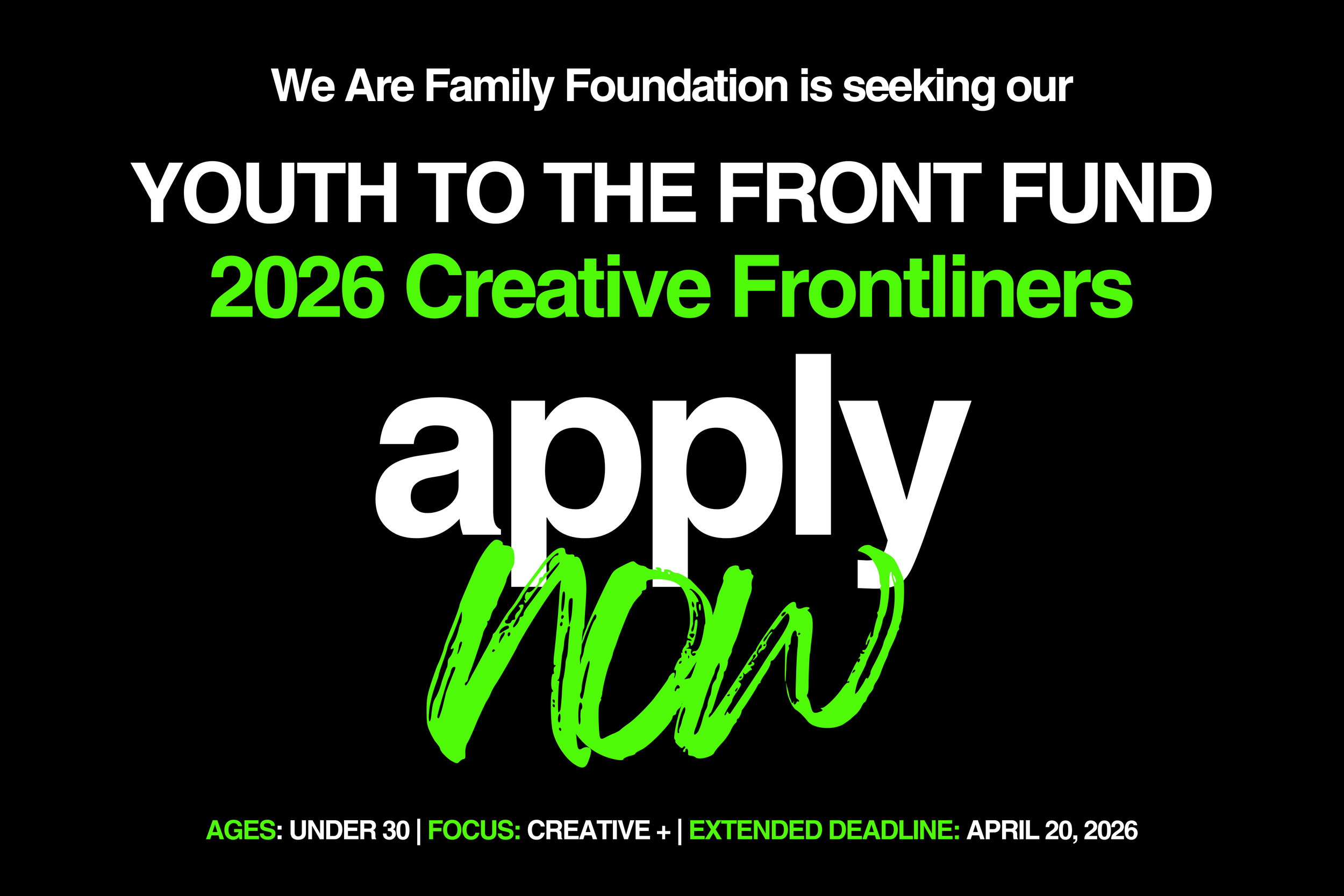 In 2026, Youth To The Front Fund is continuing our commitment to support young leaders whose work is creating real, measurable impact in the moment. We are calling in creatives and collectives who are shaping culture, shifting narratives, organizing communities through creativity, and strengthening the ecosystems, human and environmental, that sustain us all.